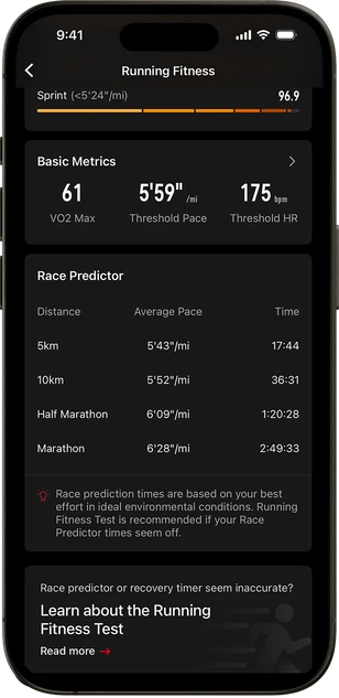 Race predictions, personalized marathon plans, a virtual pacer, and breadcrumb navigation let you know where you stand and where to go next.