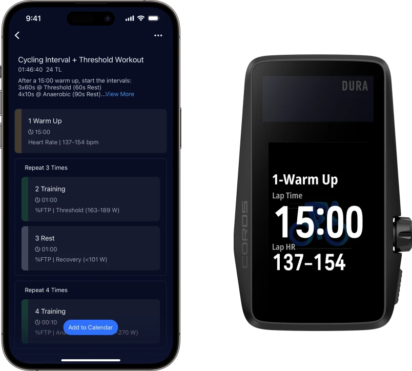 Improve your performance with free cycling training plans that sync directly to the COROS app and your COROS DURA.