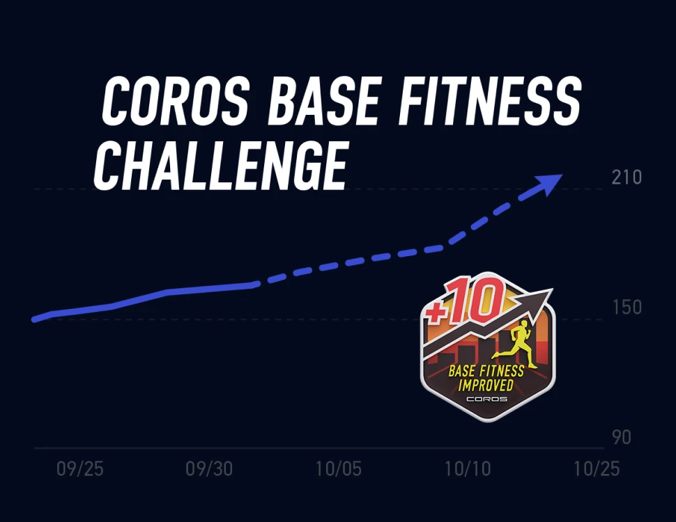 All you have to do is train with your COROS watch. It's that simple! You'll unlock the challenge badge if you increase your Base Fitness score by 10 points or more between September 25th and October 25th.