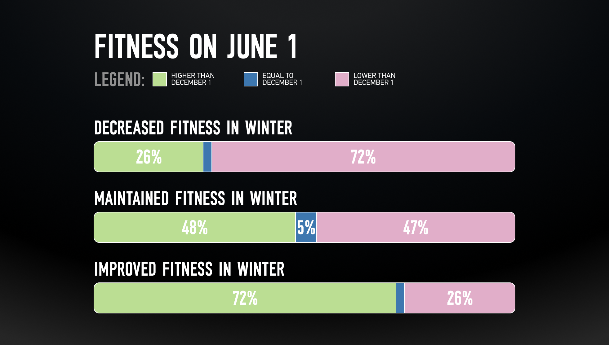 Among those who improved over winter, 33% continued to improve during spring. Meanwhile, 43% of athletes who maintained fitness in winter saw gains in spring.