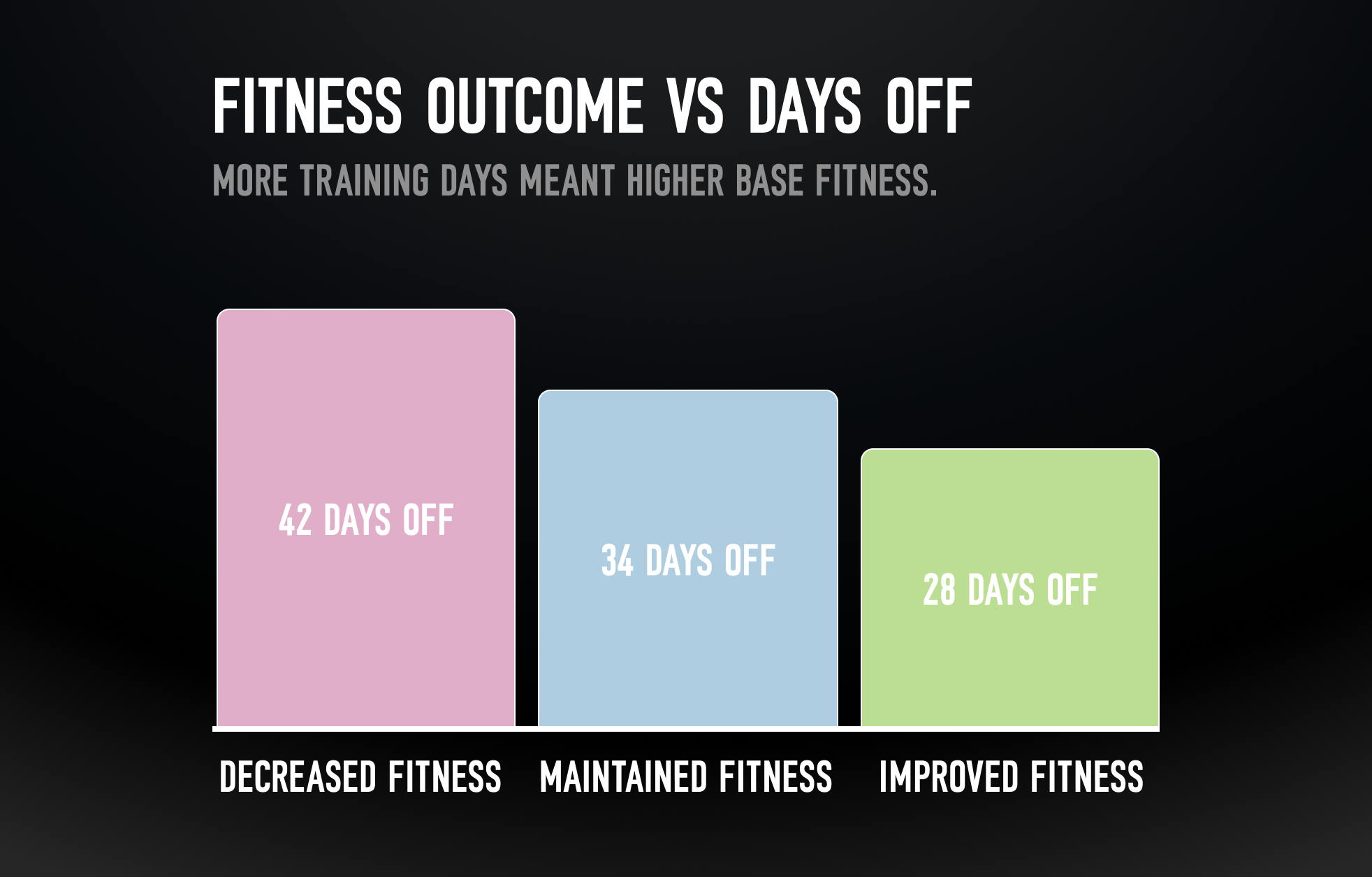 More training days meant higher Base Fitness. The pattern is clear: the fewer days off, the better the outcome. You don’t need to run every day (in fact, recovery days are an important part of training). But showing up consistently, even for short sessions, keeps your training load steady and your fitness trending upward.
