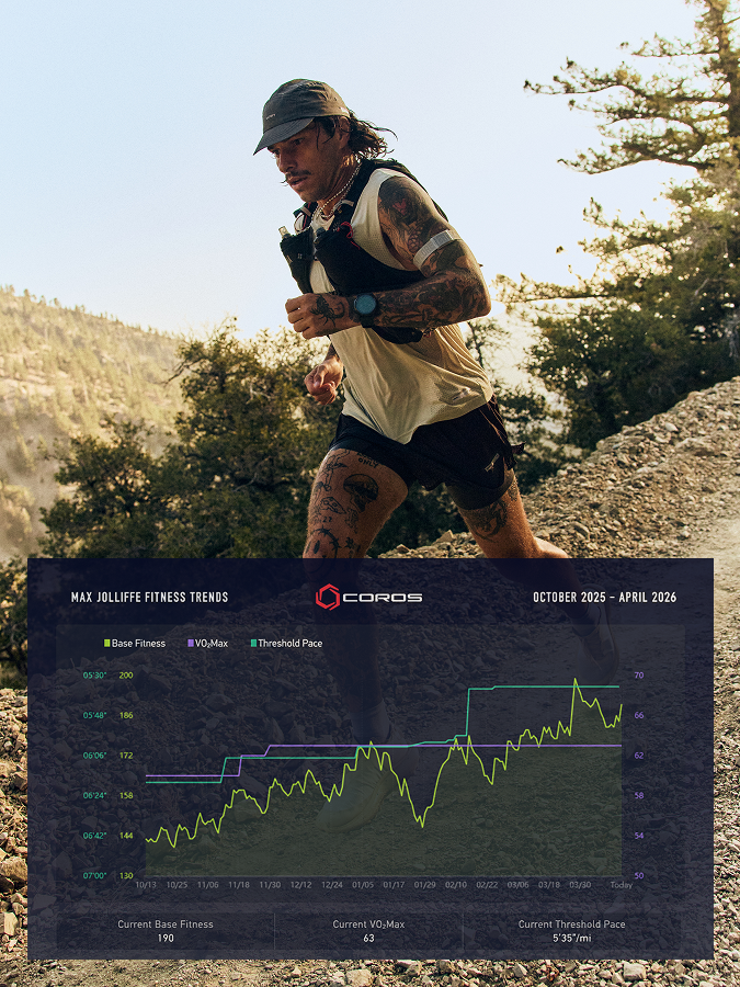 That changes this year. As a COROS athlete, Max now has a watch built for exactly this kind of effort. Turn-by-turn navigation keeps him on course, and fuel reminders prompt him before his energy runs low. The COROS Heart Rate Monitor and COROS POD work in tandem to make sure every session (even heat training on a treadmill) reflects what's actually happening in his body.