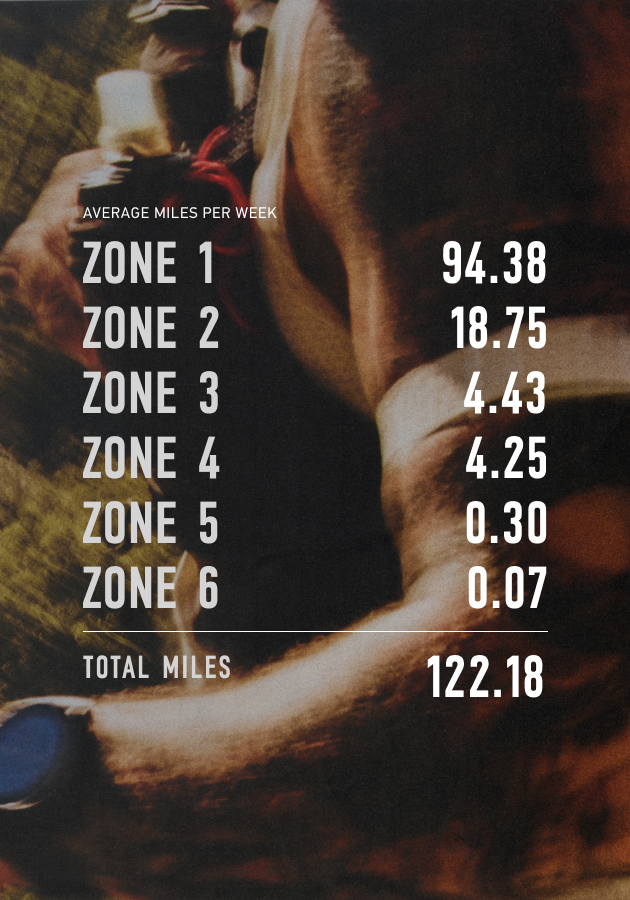 A look at his weekly mileage breakdown shows just how deliberate that balance is. Nearly all of his volume is in heart rate zones 1 & 2, with only a handful in zones 3 & 4, and anything above threshold is nearly out of the question. All of his training is specific for races of 200-plus miles.